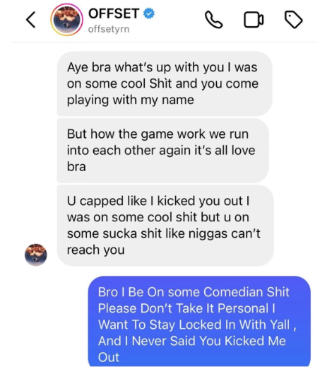 “This dm is maaa old the only reason you got a dm is cause you lied and said offset kicked you out the studio when we was both being super nice to you of the strength of our boy PO,”