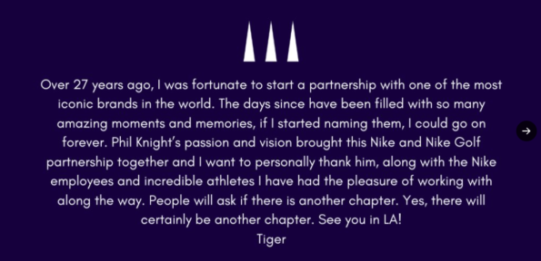 “Over 27 years ago, I was fortunate to start a partnership with one of the most iconic brands in the world. The days since have been filled with so many amazing moments and memories, if I started naming them, I could go on forever. Phil Knight’s passion and vision brought this Nike and Nike Golf partnership together and I want to personally thank him, along with the Nike employees and incredible athletes I have had the pleasure of working with along the way. People will ask if there is another chapter. Yes, there will certainly be another chapter. See you in LA!”