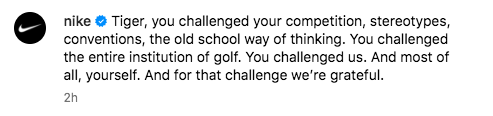 “Tiger, you challenged your competition, stereotypes, conventions, the old school way of thinking. You challenged the entire institution of golf. You challenged us. And most of all, yourself. And for that challenge we’re grateful.”