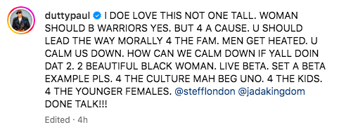 “I DOE LOVE THIS NOT ONE TALL. WOMAN SHOULD B WARRIORS YES. BUT 4 A CAUSE. U SHOULD LEAD THE WAY MORALLY 4 THE FAM. MEN GET HEATED. U CALM US DOWN. HOW CAN WE CALM DOWN IF YALL DOIN DAT 2. 2 BEAUTIFUL BLACK WOMAN. LIVE BETA. SET A BETA EXAMPLE PLS. 4 THE CULTURE MAH BEG UNO. 4 THE KIDS. 4 THE YOUNGER FEMALES. @stefflondon @jadakingdom DONE TALK!!!”