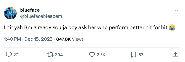 “I hit yah Bm already soulja boy ask her who perform better hit for hit.”