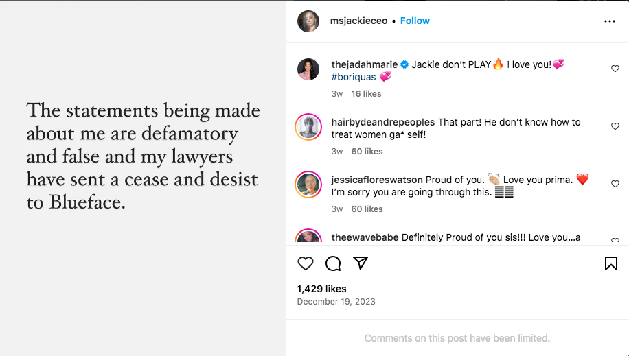 Martinez revealed that she’d sent a cease and desist letter to Blueface via her Instagram.