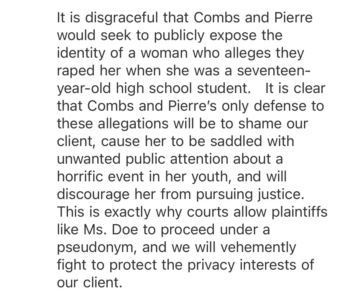“It is clear that Combs and Pierre’s only defense to these allegations will be to shame our client, cause her to be saddled with unwanted public attention about a horrific event in her youth, and will discourage her from pursuing justice.”