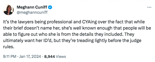 “It’s the lawyers being professional and CYAing over the fact that while their brief doesn’t name her, she’s well known enough that people will be able to figure out who she is from the details they included. They ultimately want her ID’d, but they’re treading lightly before the judge rules.”