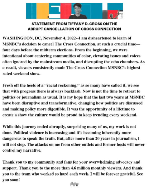 As previously reported, in November 2022, MSNBC made the abrupt decision to cancel Tiffany Cross’ weekend series, “The Cross Connection,” after a nearly two-year run. Allegedly, the firing had to do with the political analyst’s candid commentary made on the series and elsewhere. After she was let go, Tiffany Cross released a statement, sharing that she was “disheartened” by the shocking news but her work “is not done.” She added,