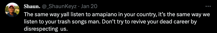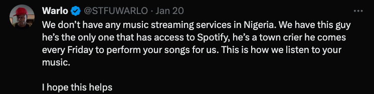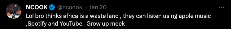 “Lol bro thinks africa is a waste land, they can listen using apple music,Spotify and YouTube. Grow up meek”