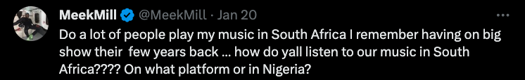 As others went on to reversely insult Meek’s overall intelligence, others opted to indulge in his post. Some African natives sarcastically joked about various ways they listen to music at the expense of those, like Meek, who are seemingly unaware that many of their countries have access to the same streaming services that are available worldwide.