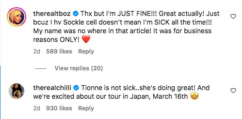 Commenters shared their well wishes for T-Boz, though the singer herself has not alluded to her sickness being a factor in the recent postponement. Many also shared their excitement for when the group is finally able to make their Australia return.
