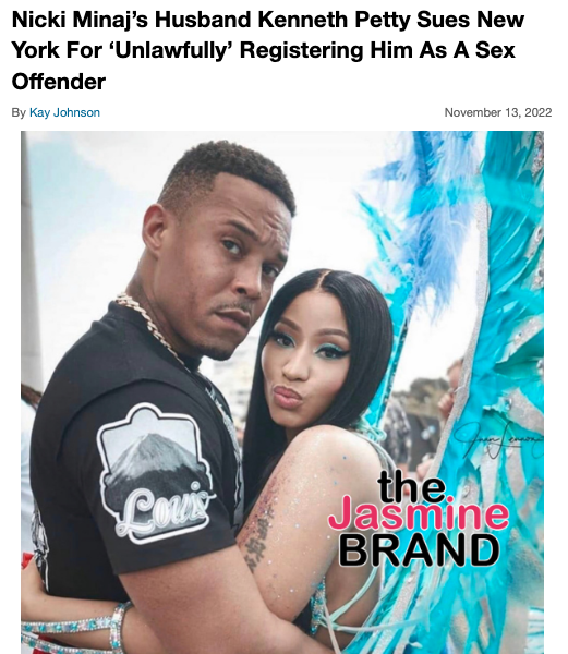 As social media users quickly discovered, Megan’s Law is a real piece of US legislation that requires sex offender registration and information to be made public. It’s no secret that Nicki’s husband has battled his own sex offender registration complications that stem from an alleged rape and attempted murder charge that took place back in 1995. Petty was even briefly detained due to failing to register after moving to California from New York, though he has since appealed the charge.