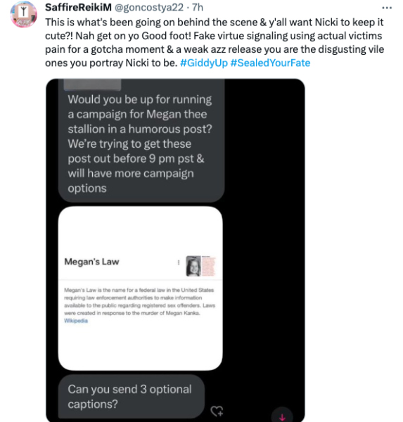 Nicki took to her X account (formerly Twitter) to make it clear that she was in fact responding to Megan’s diss about her husband. The 41-year-old “Pink Friday” artist liked several tweets that explained Megan’s Law and defended her reason for responding.