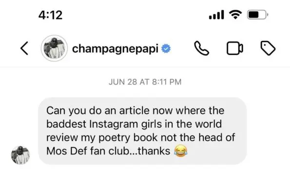 “Can you do an article now where the baddest Instagram girls in the world review my poetry book not the head of Mos Def fan club…thanks”