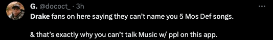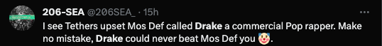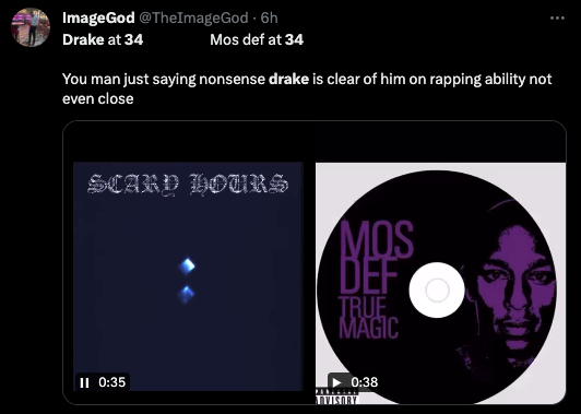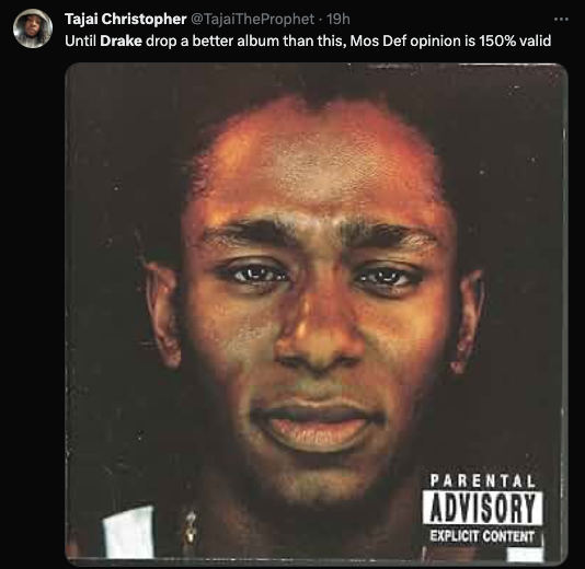 While it doesn’t appear that the OVO records founder has responded to Mos Def’s most recent remarks about his music at this time, his fans didn’t hesitate to come to his defense. Many Drake supporters have since been pushing back at the notion he isn’t a hip-hop artist by sharing their favorites of his projects. One user shared a snippet of his song “Say What’s Real” from his 2009 mixtape “So Far Gone”, writing: