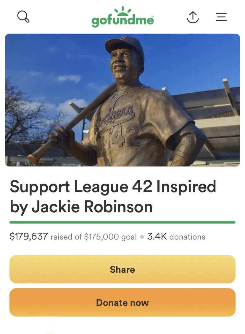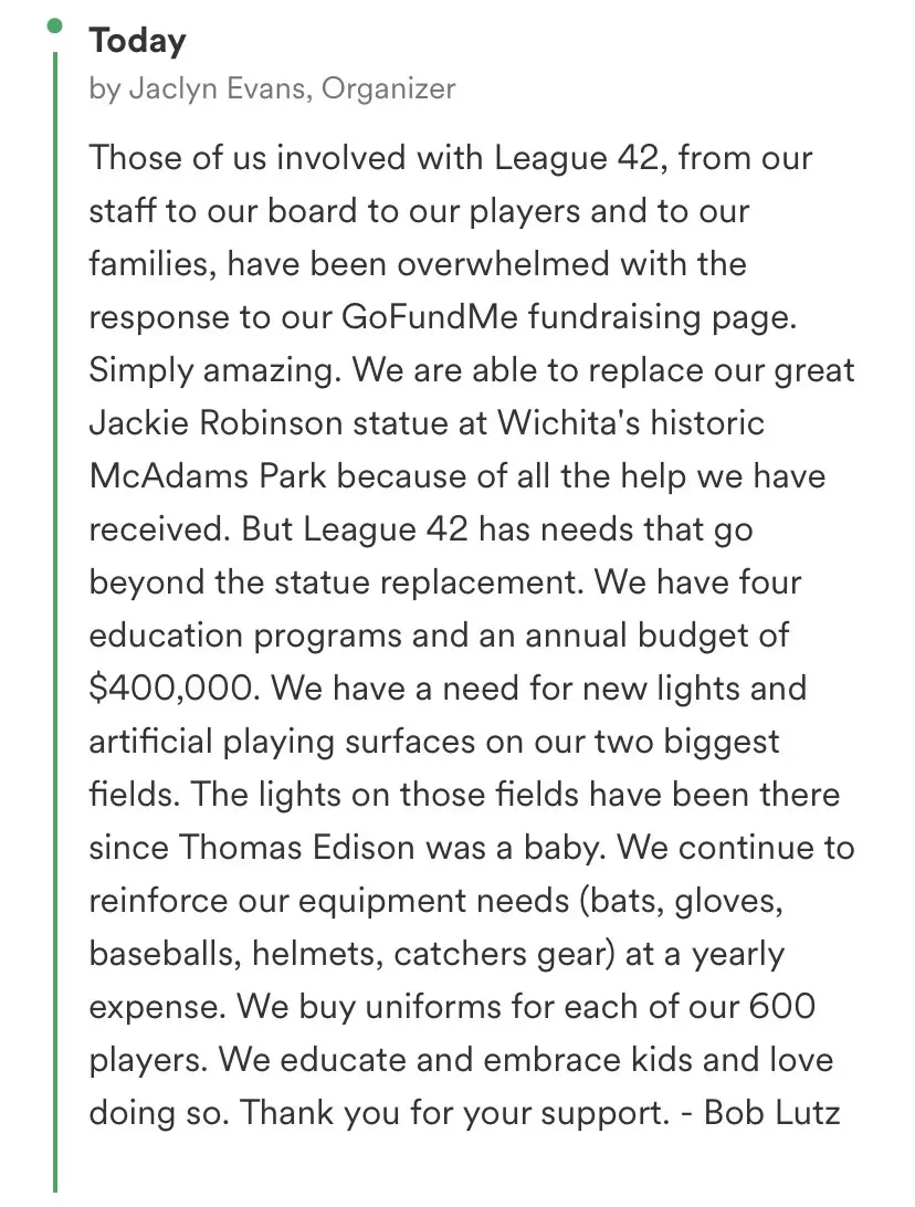 “Those of us involved with League 42, from our staff to our board to our players and to our families, have been overwhelmed with the response to our GoFundMe fundraising page. Simply amazing. We are able to replace our great Jackie Robinson state at Wichita’s historic McAdams Park because of all the help we have received.”