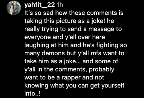 At this time the musician hasn’t shared any further explanation behind the image. However, that didn’t stop his fans from sending some heartfelt thoughts and messages of support. Commenters took to YoungBoy’s post sharing their love for him as well as encouraging him to reach out to someone if he feels like he needs help.