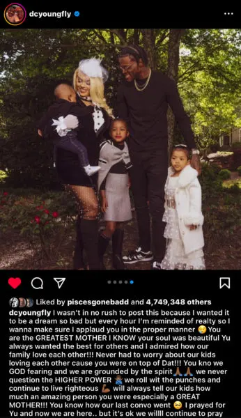 “You know how our last convo went. I prayed for you, and now we are here… But it’s ok. We will continue to pray and hold on to our FAITH because that’s all we know!! [I] love you forever, and our kids are super strong. They helpin’ me wit my tranquility no kap!!!!! U with me forever. The QUEEN of my children will always have a spot in my heart and the paradise (You gon’ get me for dat, but it’s true). [I] LOVE YOU FOREVER. Just know we goin’ harder than ever, and GOD is in control, and he got us covered.”