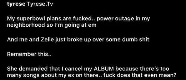 In a video post on Instagram, the actor and singer shared a trailer for his new and upcoming album “Beautiful Pain.” In the same post, Tyrese revealed that his girlfriend, Zelie Timothy, broke up with him because he had “too many songs” about his ex-wife, Samantha Lee, on the album.