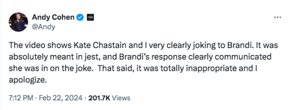 “The video shows Kate Chastain and I very clearly joking to Brandi. It was absolutely meant in jest, and Brandi’s response clearly communicated she was in on the joke. That said, it was totally inappropriate and I apologize.”