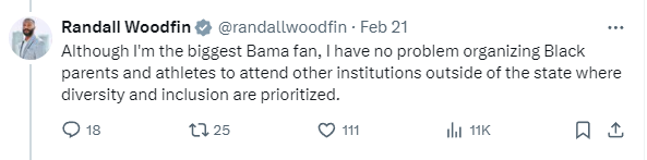 “Although I’m the biggest Bama fan, I have no problem organizing Black parents and athletes to attend other institutions outside of the state where diversity and inclusion are prioritized.”