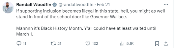 “If supporting inclusion becomes illegal in this state, hell, you might as well stand in front of the school door like Governor Wallace. Mannnn it’s Black History Month. Y’all could have at least waited until March 1.”