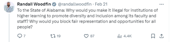 “To the State of Alabama: Why would you make it illegal for institutions of higher learning to promote diversity and inclusion among its faculty and staff? Why would you block fair representation and opportunities for all people?”