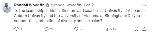 “To the leadership, athletic directors and coaches at University of Alabama, Auburn University and the University of Alabama at Birmingham: Do you support this prohibition of diversity and inclusion?”