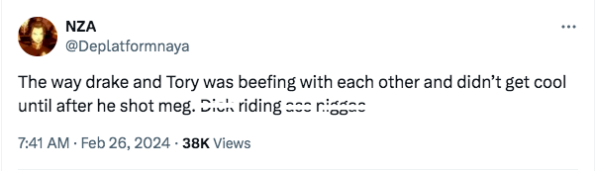 “The way drake and Tory was beefing with each other and didn’t get cool until after he shot meg. D*ck riding a** n*gg*s”