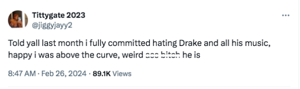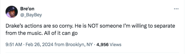 “Drake’s actions are so corny. He is NOT someone I’m willing to separate from the music. All of it can go”