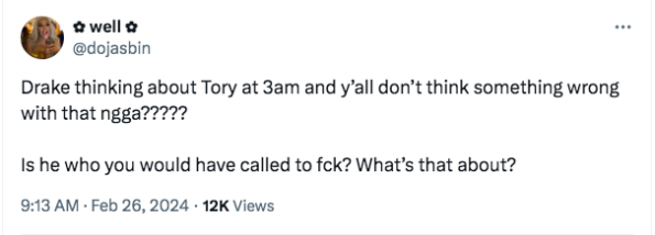 “The way drake and Tory was beefing with each other and didn’t get cool until after he shot meg. D*ck riding a** n*gg*s”