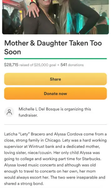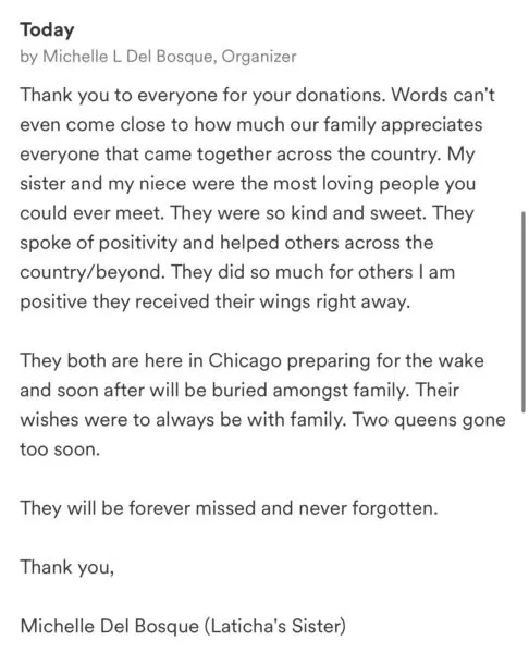 “Thank you to everyone for your donations. Words can’t even come close to how much our family appreciates everyone that came together across the country. My sister and my niece were the most loving people you could ever meet. They were so kind and sweet. They spoke of positivity and helped others across the country/beyond. They did so much for others I am positive they received their wings right away.”