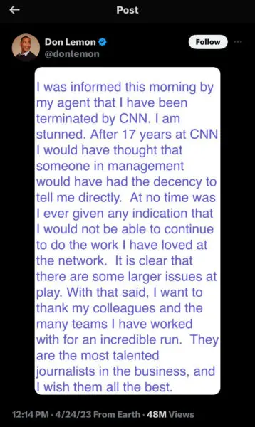 The former CNN host announced the news on his X account, explaining that he learned of his firing from his agent.