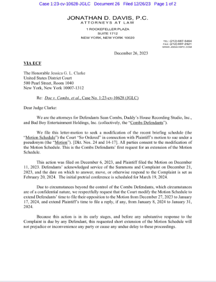 “Due to circumstances beyond the control of the Combs Defendants, which circumstances are of a confidential nature, we respectfully request that the Court modify the Motion Schedule to extend Defendants’ time to file their opposition to the Motion from December 27, 2023 to January 17, 2024, and extend Plaintiff’s time to file a reply, if any, from January 8, 2024 to January 31, 2024.”