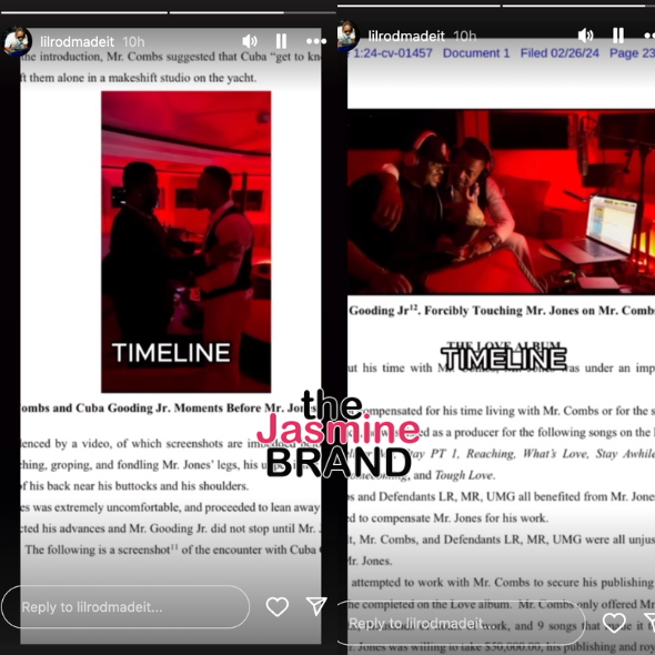 The video shows images of Diddy and Cuba Gooding, Jr. together, as well as Cuba Gooding, Jr. with his arm around Lil Rod. Screengrabs of Lil Rod’s lawsuit that accuses the Freedom actor of fondling and groping him without his consent are also displayed. See the images below.