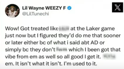 “Wow! Got treated like s— at the Laker game just now but I figured they’d do me that sooner or later either bc of what i said abt [forward Anthony Davis] or simply bc they don’t fwm which I been got that vibe from em as well so all good I get it. F*ck em. It isn’t what it isn’t. I’m used to it.”
