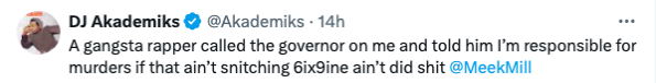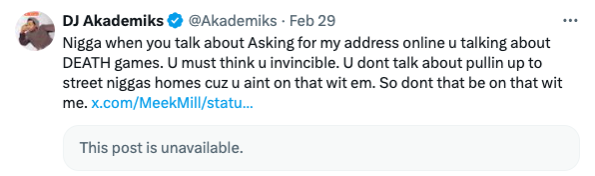 During a subsequent live stream discussing the situation, Akademiks claimed that Meek sent the police to his home. In other posts, he stated that the rapper accused him of being responsible for several murders and reversely accused him of being a snitch.