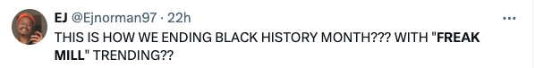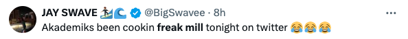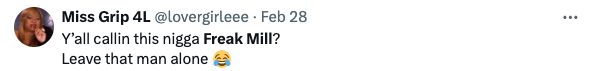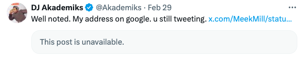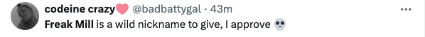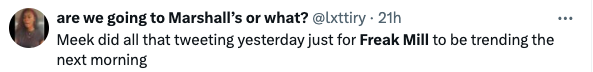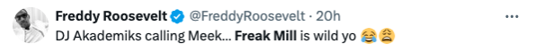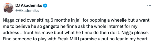 Meek went on to claim that he received a phone call from a governor friend who urged him to take down his posts. Though he bowed out of the argument, Akademiks continued. The internet personality slammed the musician for taking issue with him instead of the person who filed the suit in the first place. In one tweet, Akademiks referred to Meek as “Freak Mill” which ended up trending on the social platform. (See reactions to the moniker below.)