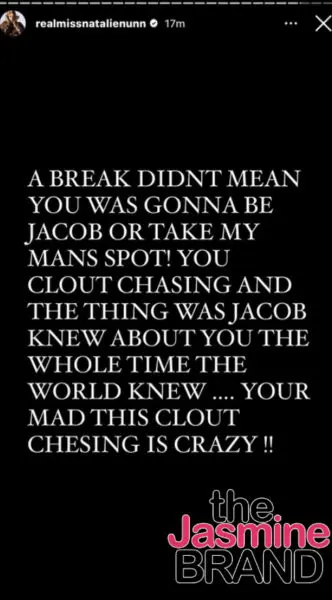 “A BREAK DIDNT MEAN YOU WAS GONNA BE JACOB OR TAKE MY MANS SPOT! YOU CLOUT CHASING AND THE THING WAS JACOB KNEW ABOUT YOU THE WHOLE TIME THE WORLD KNEW…. YOUR MAD THIS CLOUT [CHASING[ IS CRAZY!!”