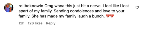 “Omg whoa this just hit a nerve. I feel like I lost apart of my family. Sending condolences and love to your family. She has made my family laugh a bunch. ??”