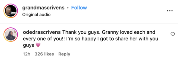 “Thank you guys. Granny loved each and every one of you!! I’m so happy I got to share her with you guys ?”