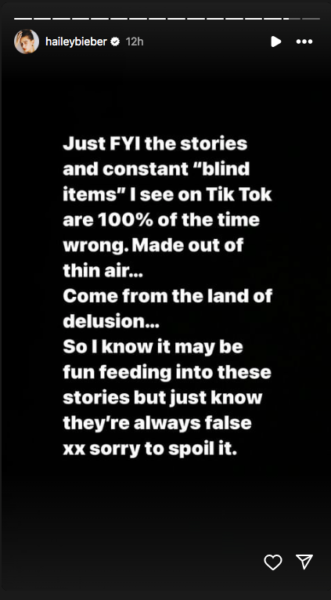 On Tuesday (March 5), Hailey Bieber posted a story on Instagram advising her fans to ignore such speculations, saying,