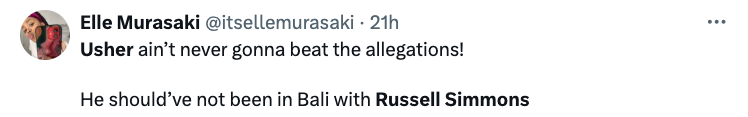 Over the past decade, Simmons has faced several other allegations of sexual assault and abuse. He’s continued to deny any wrongdoing but also seems to be waiting the situation out by remaining in Bali. Despite not facing the charges personally in court, social media users have not forgotten about the allegations. Several slammed Usher for spending time with the music mogul as it seems he’s being “complicit” to his alleged abuse.