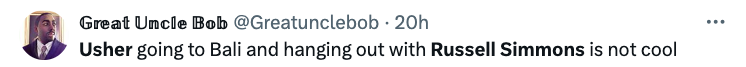 While the union seemed innocent enough, social media users were not at all amused. Many called out Usher for seemingly ignoring the fact that Simmons appears to be in Bali so he doesn’t have to answer to abuse accusations he’s facing in the states. If you recall, the 66-year-old was sued back in February of this year by a former Def Jam exec who says Simmons sexually assaulted her back in the 90’s.