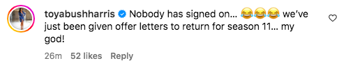 “Nobody has signed on… [laughing emojis]we’ve just been given offer letters to return for season 11… my god!”