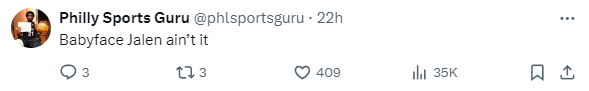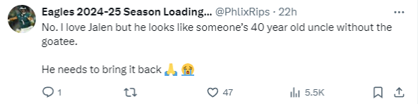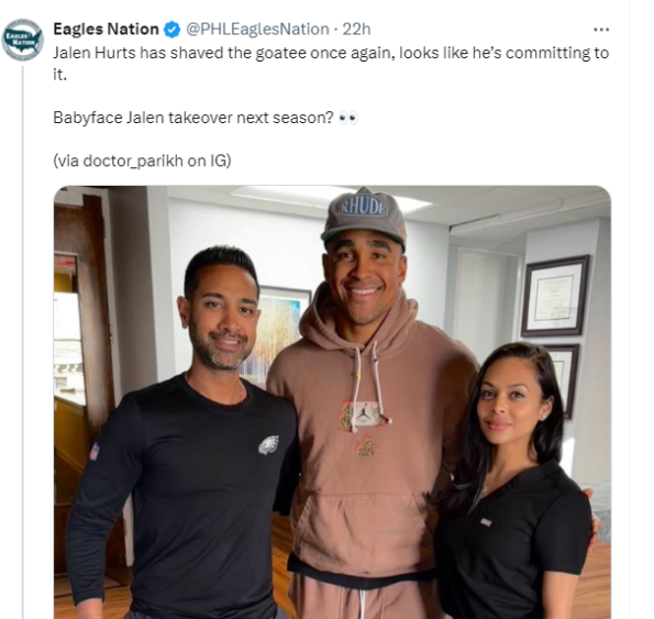 “Jalen Hurts has shaved the goatee once again, looks like he’s committing to it. Babyface Jalen takeover next season?”