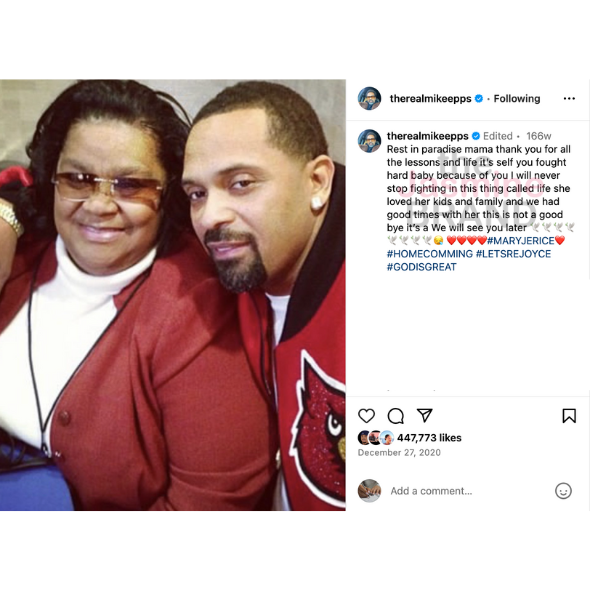 The comedian has a total of five daughters and one son. He shares two daughters, Moriah and Madison, with his ex-wife Mechelle McCain, as well as Makayla and Bria from previous relationships. He and his wife Kyra, whom he married in June 2019, welcomed daughter Indiana Rose in March 2020 and son Mike Epps, Jr. in October 2021. Mike shared news of his mother’s death on social media in December 2020.