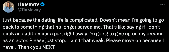 “Just because the dating life is complicated. Doesn’t mean I’m going to go back to something that no longer served me. That’s like saying if I don’t book an audition our a part right away I’m going to give up on my dreams as an actor. Please just stop. I ain’t that weak. Please move on because I have . Thank you NEXT.”
