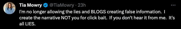 “I’m no longer allowing the lies and BLOGS creating false information. I create the narrative NOT you for click bait. If you don’t hear it from me. It’s all LIES.”