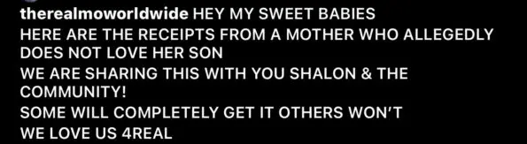 “HEY MY SWEET BABIES HERE ARE THE RECEIPTS FROM A MOTHER WHO ALLEGEDLY DOES NOT LOVE HER SON WE ARE SHARING THIS WITH YOU SHALON & THE COMMUNITY! SOME WILL COMPLETELY GET IT OTHERS WON’T WE LOVE US 4REAL”