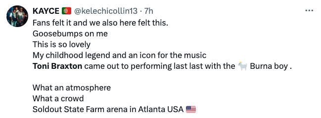 BURNA BOY BROUGHT OUT TONI BRAXTON TO PERFORM HIS GLOBAL HIT “LAST LAST” INFUSED WITH HER CLASSIC LIVE AT THE STATE FARM ARENA IN ATLANTA! ? pic.twitter.com/tc6BVZ9UK0