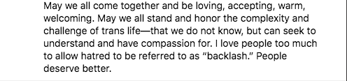 “May we all stand and honor the complexity and challenge of trans life—that we do not know, but can seek to understand and have compassion for.”
