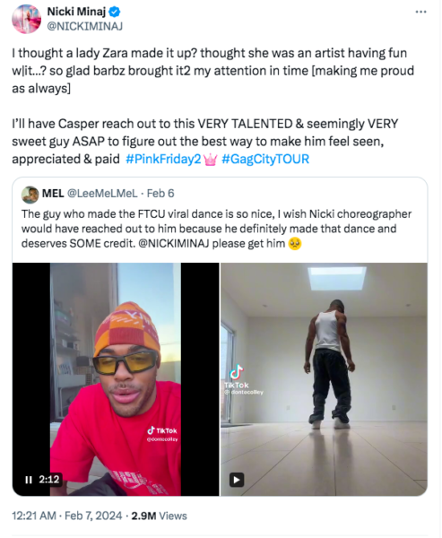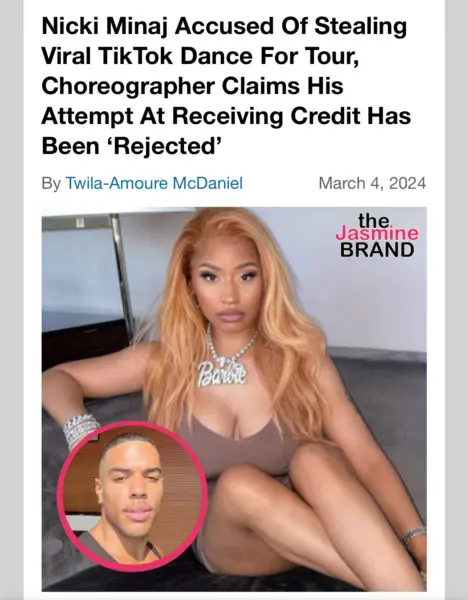 “I really appreciate Nicki tweeting, saying that she wanted to make things right. However, the person that she has put in charge has not made this a positive experience, and all I asked for was for her to repost the original video and to tag me, just like the other videos. And if that’s not possible, to just remove the choreo.”